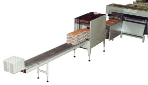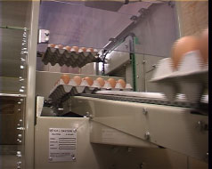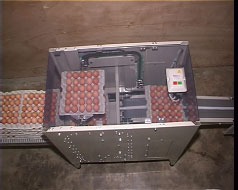 This machine has been developed for stacking of filled egg trays on farm packers and grading machines: